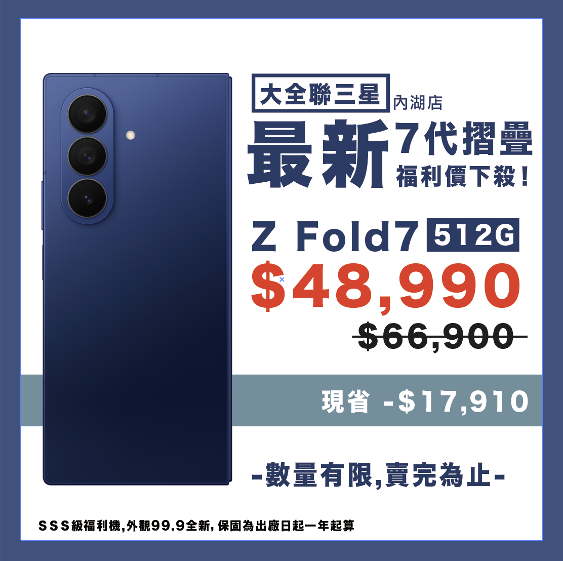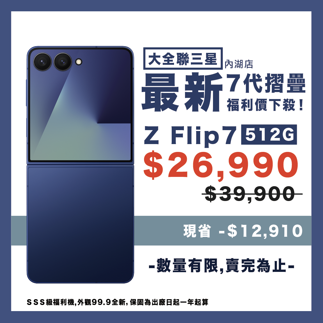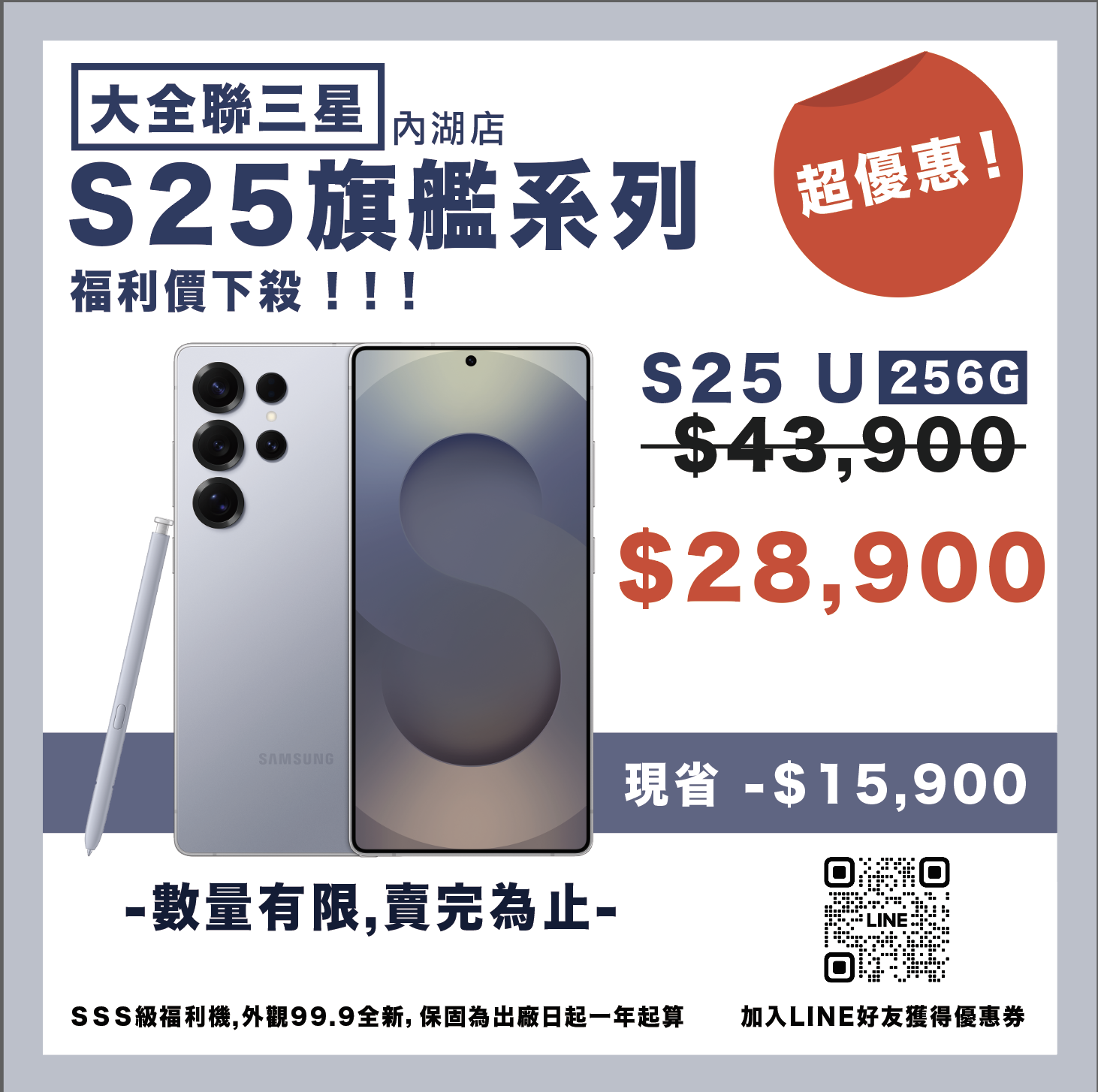 顏色及型號僅供參考,實機樣式顏色及外觀庫存狀況請到現場觀看 福利品無法保留,賣完為止 亦可來電詢問是否有相關顏色及庫存 本網站只提供參考樣式及價格,並無線上購買及線上付款服務 如需購買請到內湖大潤發三星門市選購~ 福利機購買注意事項: 福利機購買前均會讓顧客充分體驗並檢查,故不接受以外觀或功能作為換貨之理由。 福利機不適用15日內新品不良換新。 福利機保固為出廠日一年計算,如過保,門市將提供3個月店內非人為保固 福利機可能帶有些微使用痕跡或刮痕,但功能正常。 部分功能如防水防塵可能有所減損,無法提供保證。 • • 實際包裝和配件可能與全新機器略有不同,但不影響功能使用。